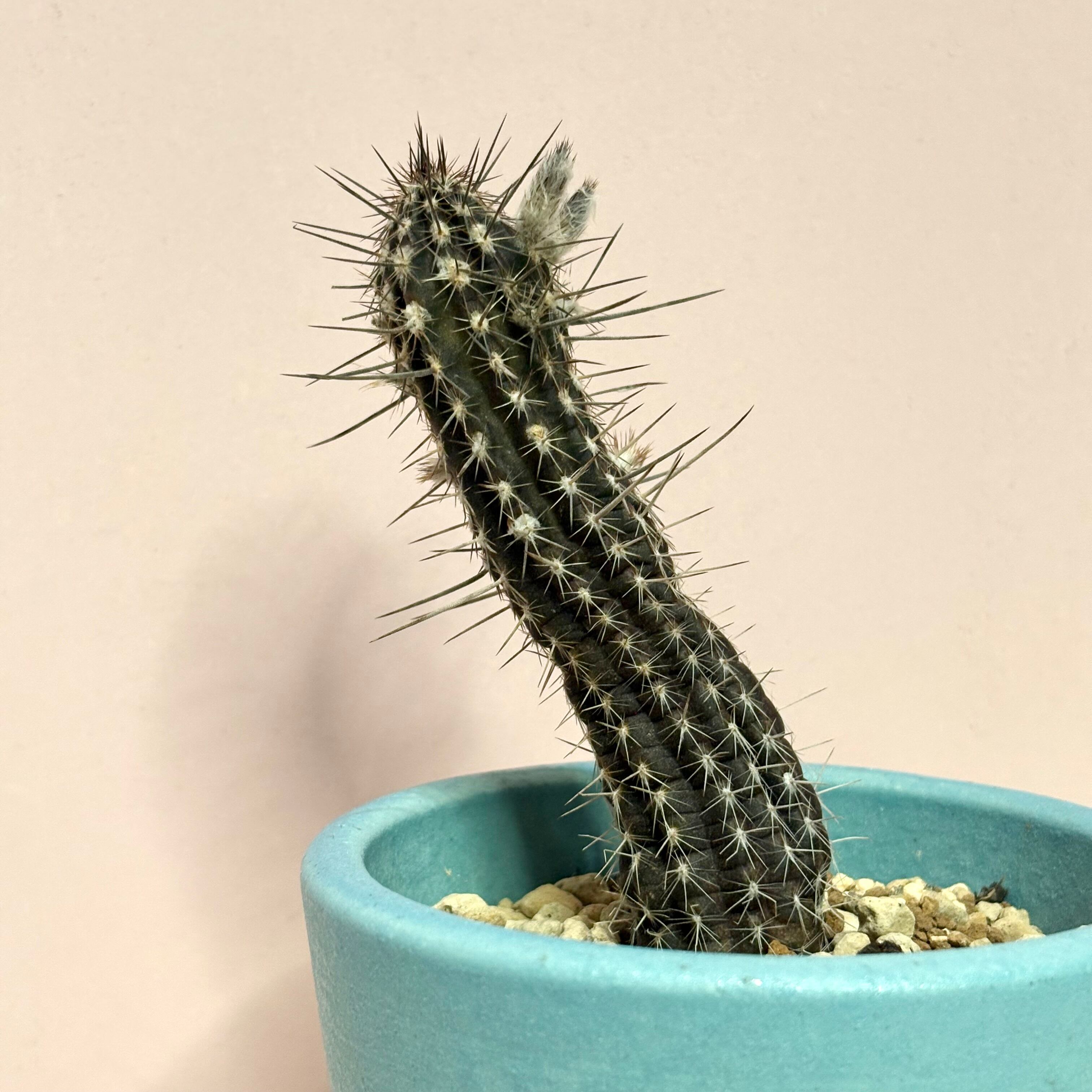 細長いフォルムのサボテンで、夜に大輪の白い花を咲かせる姿から「奇想丸」と呼ばれます。花は一夜限りの幻想的な美しさで、コレクターにも人気の高い希少種です。
