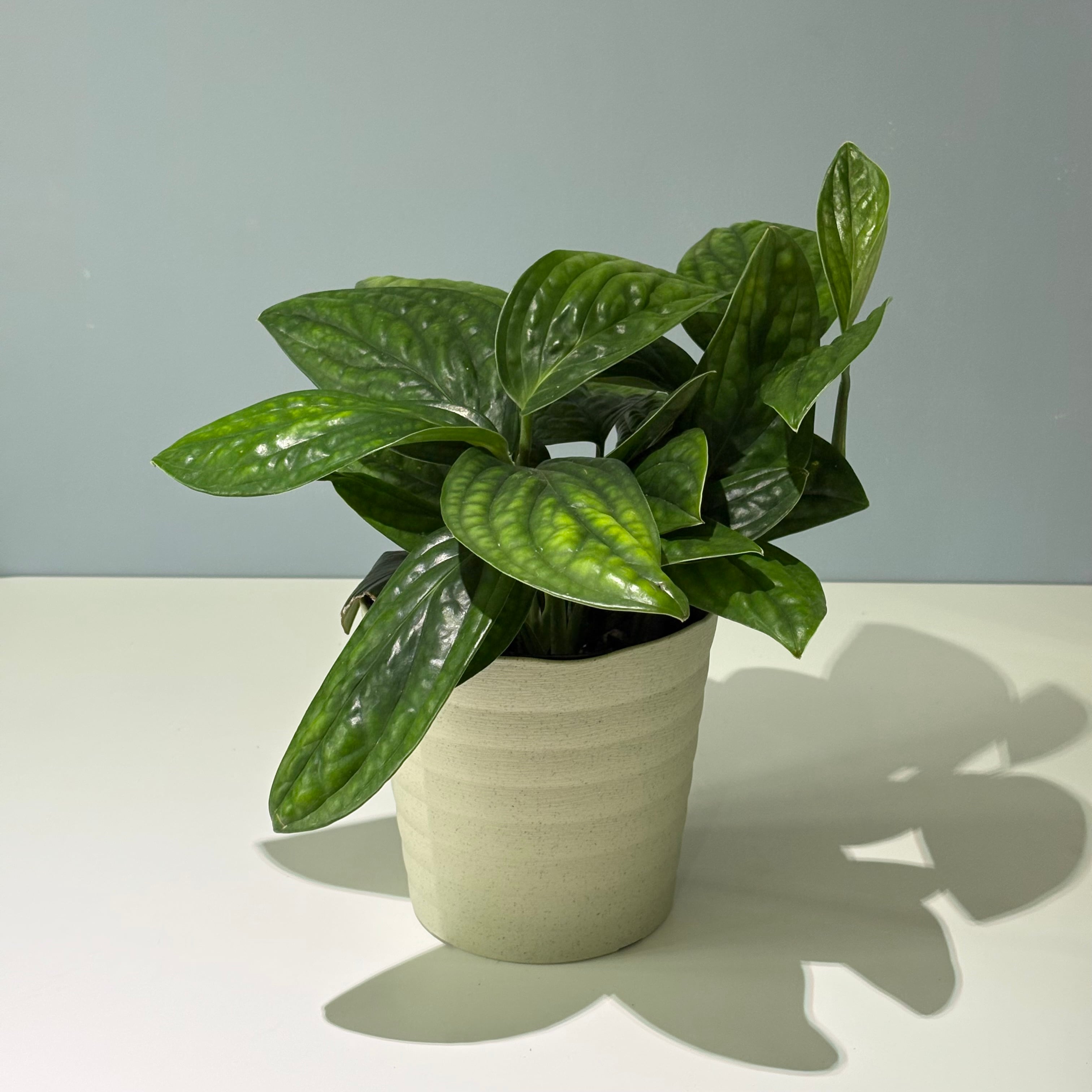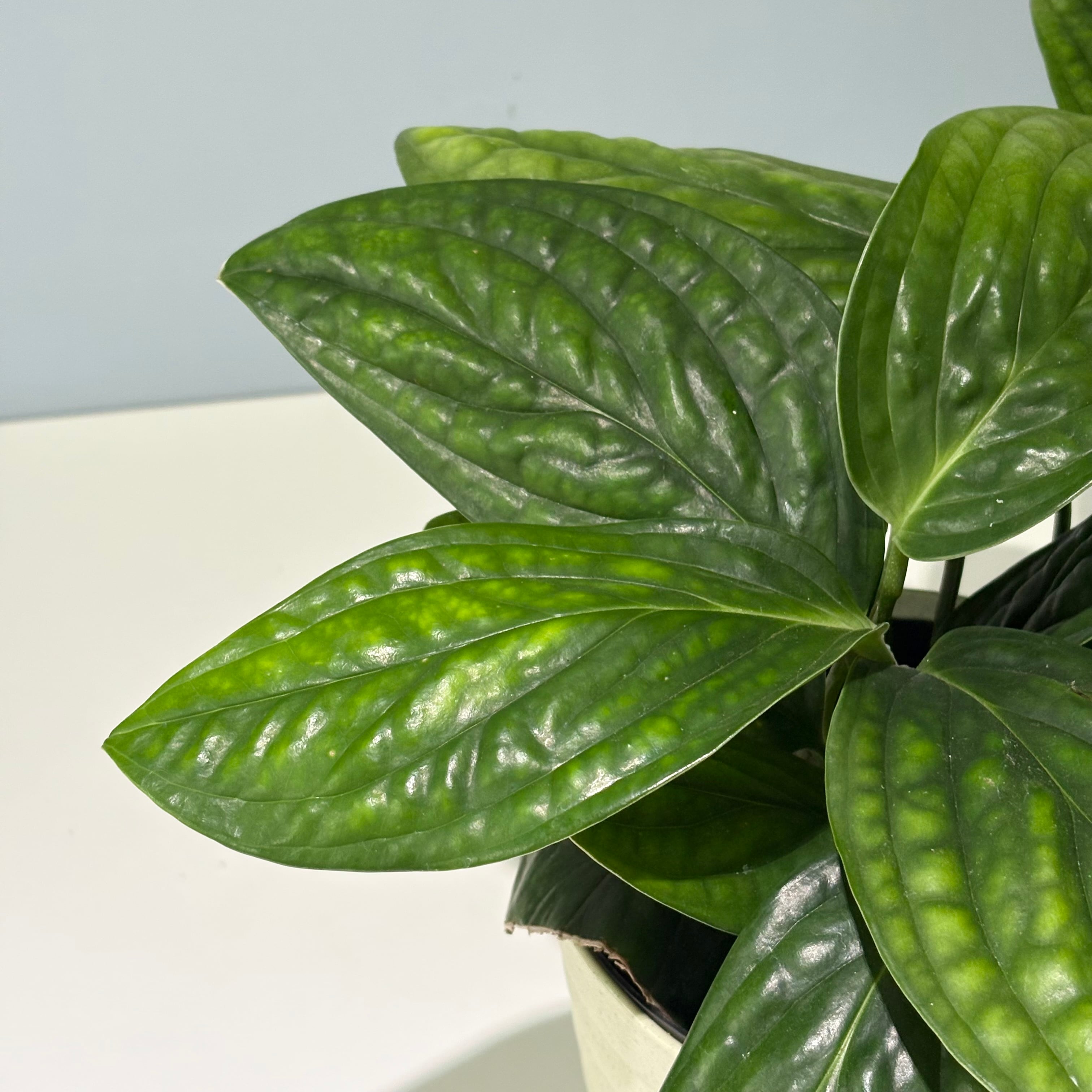 深い緑の葉に立体感のある葉脈が特徴的な可愛い観葉植物。
