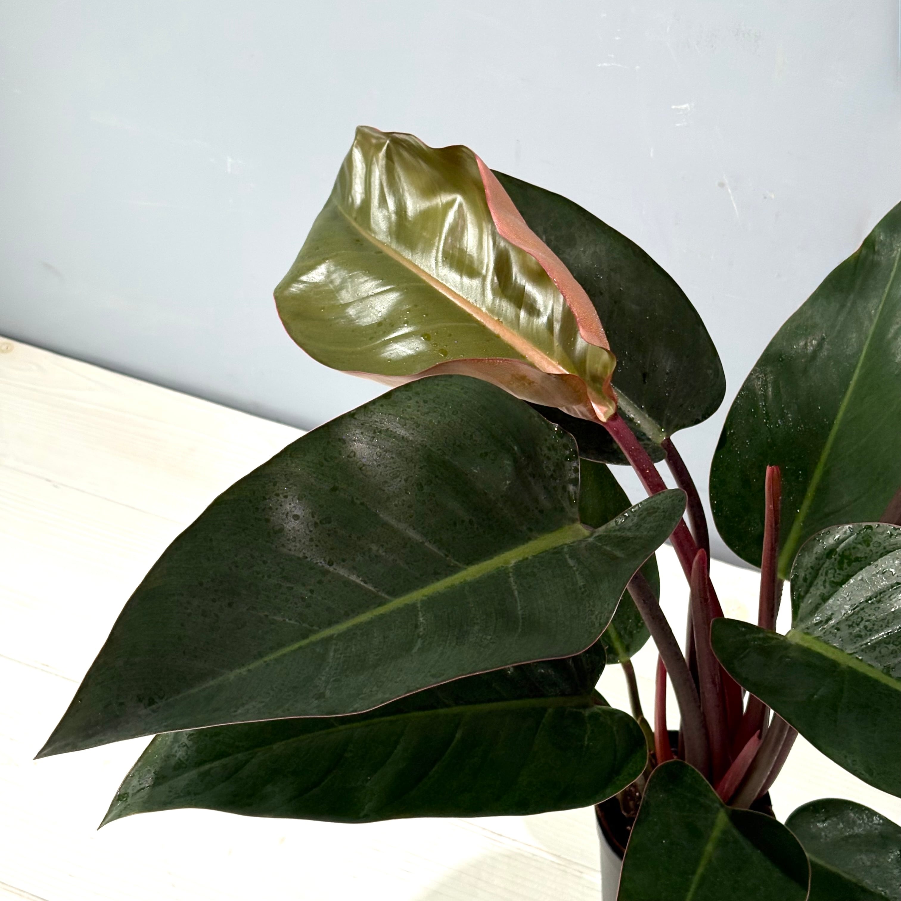 深い緑の葉と赤みのある茎が特徴的なフィロデンドロン。